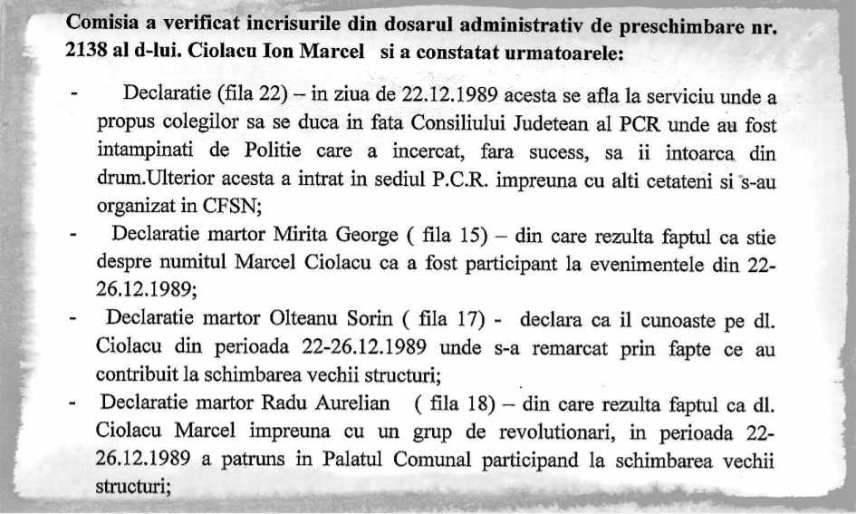 - Cererea pe care liderul PSD a depus-o pentru obținerea noului certificat a fost analizată de o comisie condusă de Laurențiu Coca, la acel moment secretar de stat pe problemele revoluționarilor și coleg de partid cu Marcel Ciolacu. A trecut cu trei voturi pentru și două împotrivă, după ce doi dintre componenții comisiei, având atribuții juridice, au considerat că Ciolacu nu se încadrează în lege. Ei au scris în procesul-verbal că din dosarul liderului PSD nu rezultă nicio acțiune revoluționară înainte de fuga dictatorului. La scurt timp după aceea, cei doi au dispărut din comisie.
